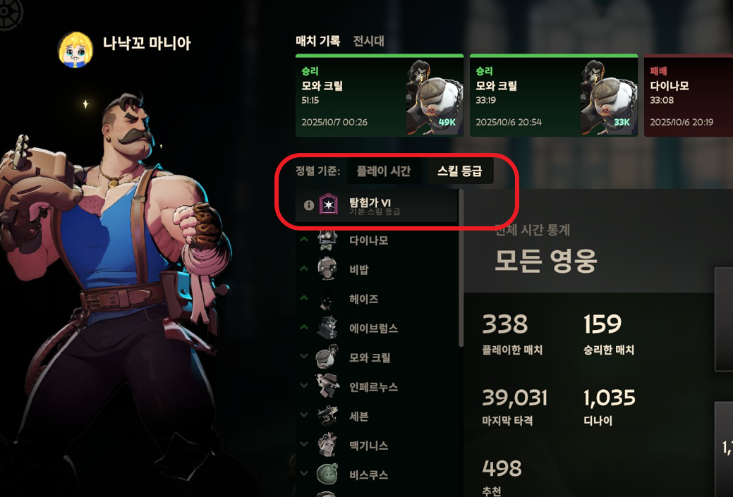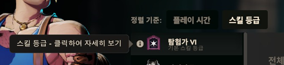 정렬기준: 플레이 시간/스킬 등급이 있는데