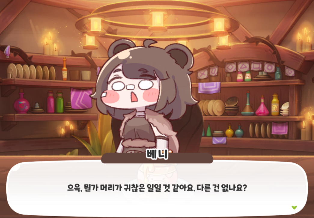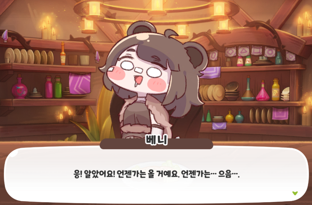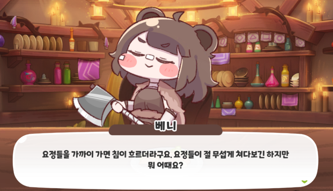 베니는 생각을 많이 하는 것보단 단순한게 좋다고 말하는 수인이다.