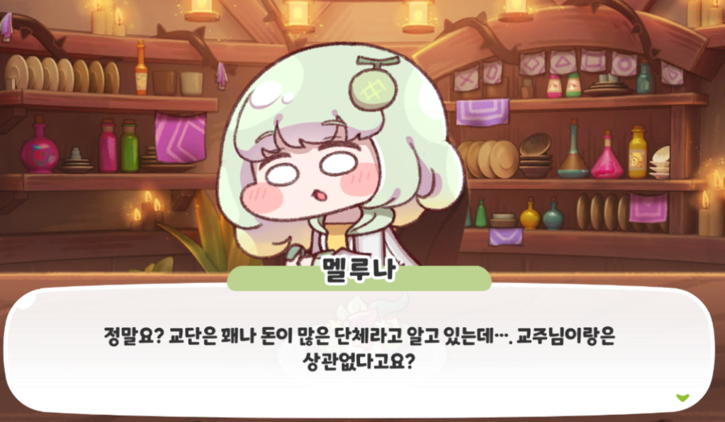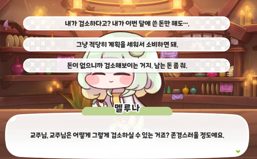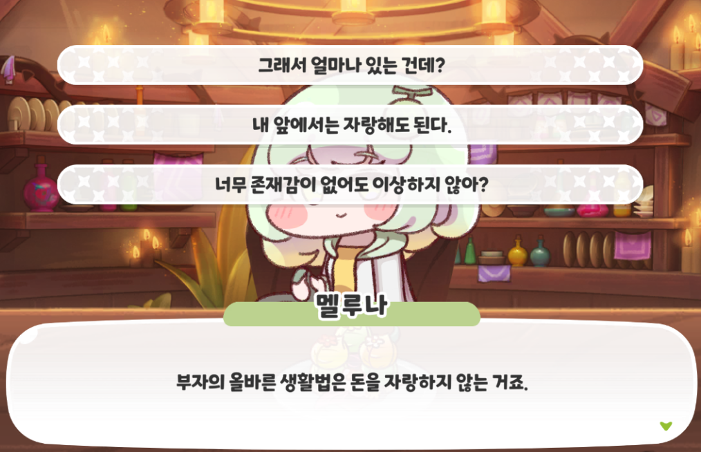다시말하지만 멜루나와 연회장 대화 대부분이 돈과 관련되어 있다.