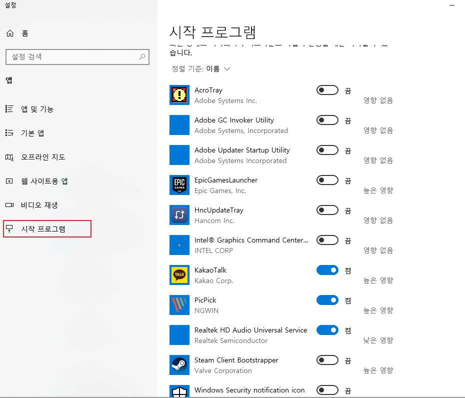 거기에 이 프로그램들이 시작 시 영향을 얼마만큼 주는지도
