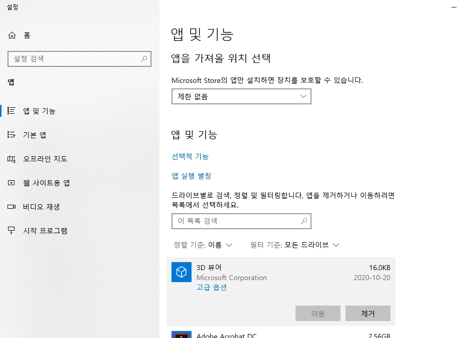 그냥 앱 및 기능에서 해당 목록을 검색하고