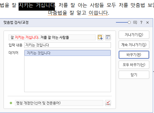 모두 바꾸기를 눌러서 맞춤법 수정을 해도 됩니다.