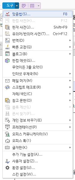 또는 도구의 옆을 누르게 되면 이렇게 맞춤법을 체크할 수 있습니다.