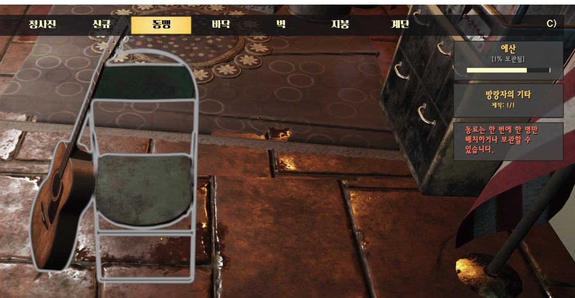 캠프 항목 내에서 '동맹'란에 방랑자의 기타를 설치하면 끝납니다.
