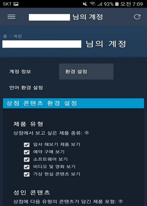 환경 설정에서는 상점 콘텐츠 환경 설정에서